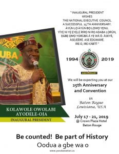 This was what led to Yoruba International Union Dallas to convey the first National Convention of all Pan Yoruba associations in the United States of America. Egbe Isokan Yoruba Washington D.C. was planning a similar meeting at the time but it was postponed because Yoruba International already sent out invitation. It suffices to record that Yoruba International Union first cause of action was to organize an inter-faith prayer meeting for Nigeria; the Preacher was Dr. Joshua Dara. At the end of the prayer meeting the outcome was the inspired idea to organize the Yorubas in North America to commence the struggle for the Liberation of Yoruba Land It was the Imam of Dallas Bashir Babatunde Ashimi that whisphered the idea to Kolawole Ayodele who later presented the idea to the Yoruba International Union at their monthly meeting and the rest is history.