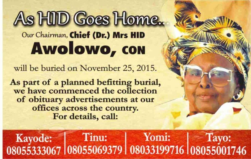 The plans were that she would contest the elections, and if she won, would step down for her husband in a by-election. To fulfil his dream of becoming president in the Second Republic, she toured the length and breadth of the country with her husband campaigning. She also coordinated the women’s wing of the party and was always present at all party caucuses. A successful businesswoman, she became the first Nigerian distributor for the Nigerian Tobacco Company (NTC) in 1957. She was the first to import lace materials and other textiles into Nigeria. On September 19, 2015, she died at the age of 99 just over 2 months short of her 100th birthday. She was laid to rest beside her husband in Ikenne on November 25, 2015.
